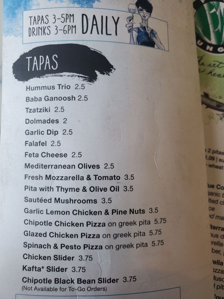 Happy Hour Tapas assortment: hummus & chicken with pine nuts, fresh mozzarella & tomato, baked pita chips, kafta mini pockets, feta, pickles, cucumbers